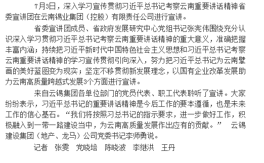 7月3日,深入学习宣传贯彻席大大总书记考察云南重要讲话精神省委宣讲团在J9国际站登录集团(控股)有限责任公司进行宣讲。
