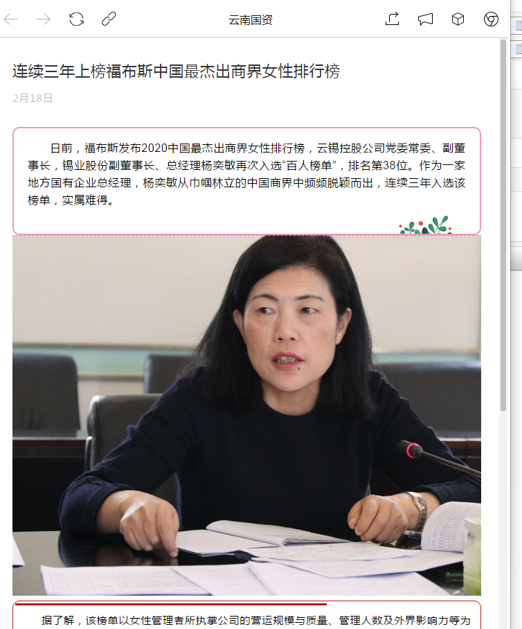 连续三年上榜布斯中国最杰出商界女性排行榜,不仅是对杨奕敏个人领导才能、经营能力、干事激情的充分肯定,也是对锡业股份可持续发展能力和投资价值的充分认可,必将激励公司更多干部职工为开创改革转型发展新局面携手共进、担当作为、奋发拼搏。