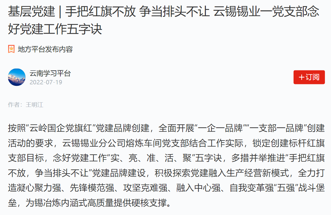 学习强国、云南国资、开屏新闻:J9国际站登录锡业分公司——手把红旗不放 争当排头不让