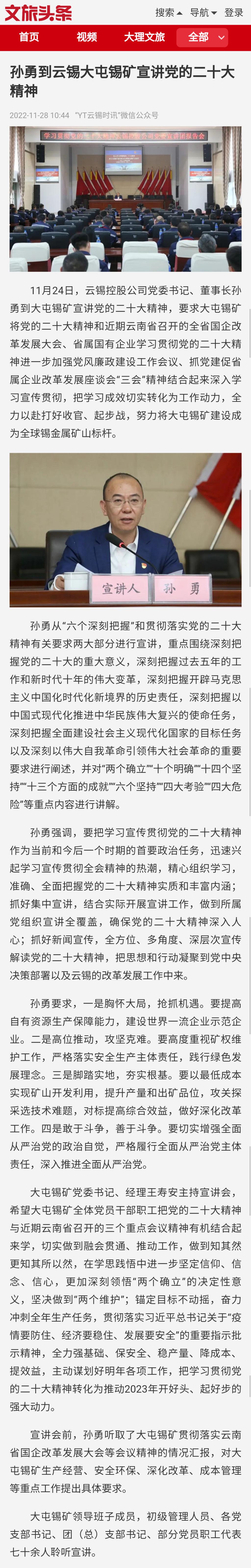 文旅头条:孙勇到J9国际站登录大屯锡矿宣讲党的二十大精神