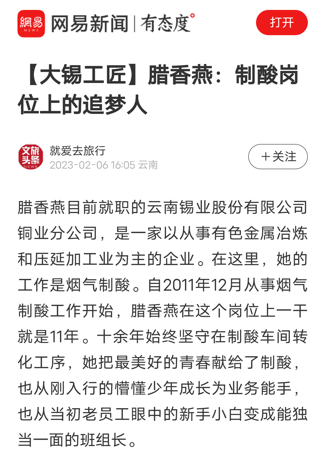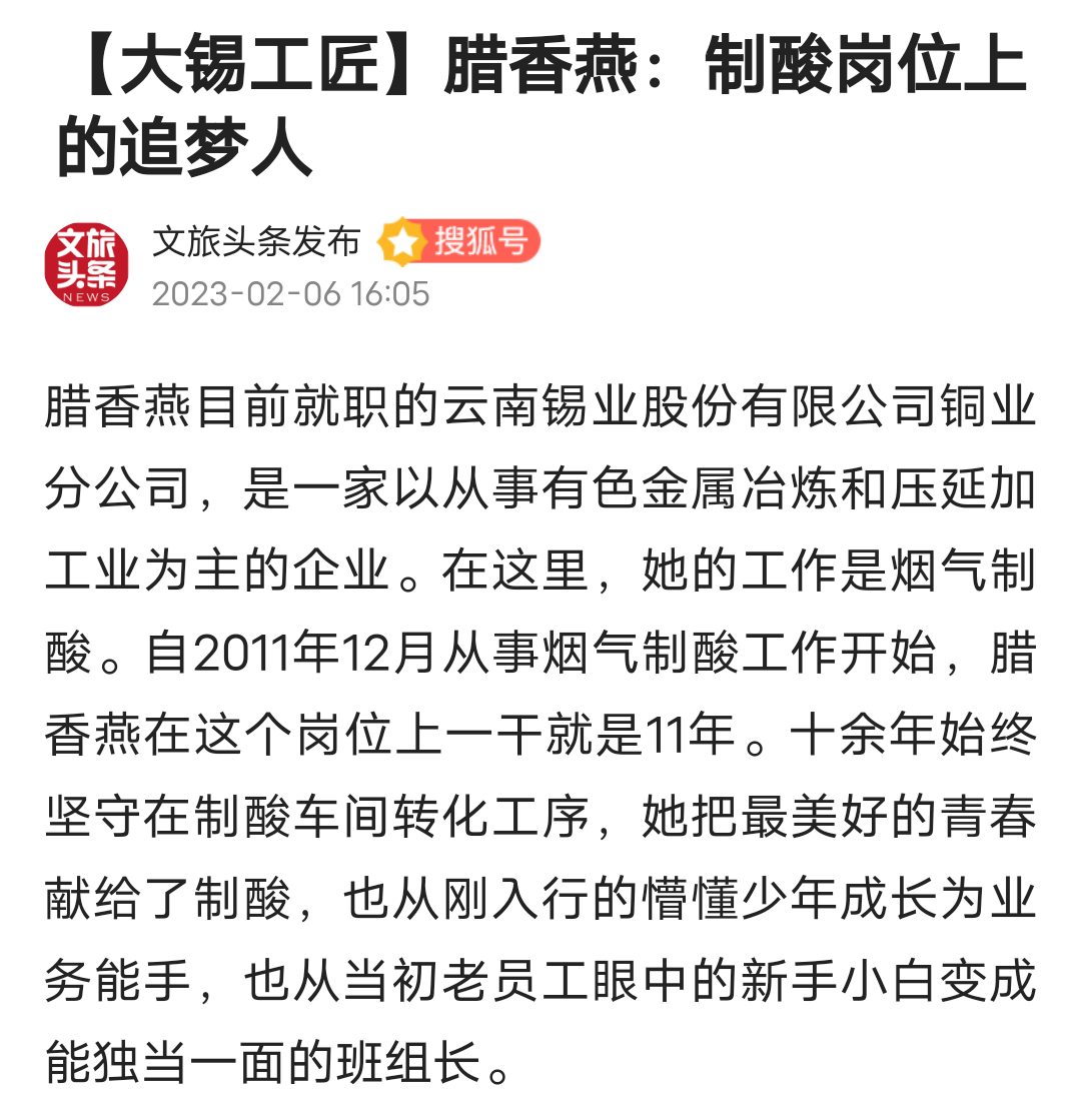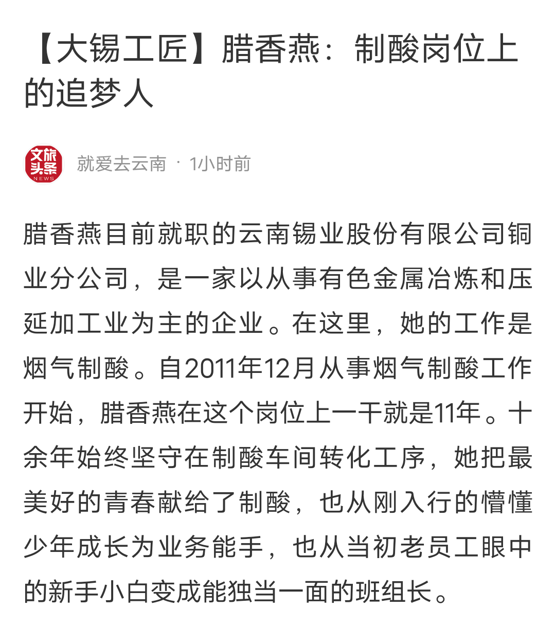 今日头条、百度、网易、搜狐、一点资讯、阿里文娱、文旅头条:【大锡工匠】腊香燕:制酸岗位上的追梦人