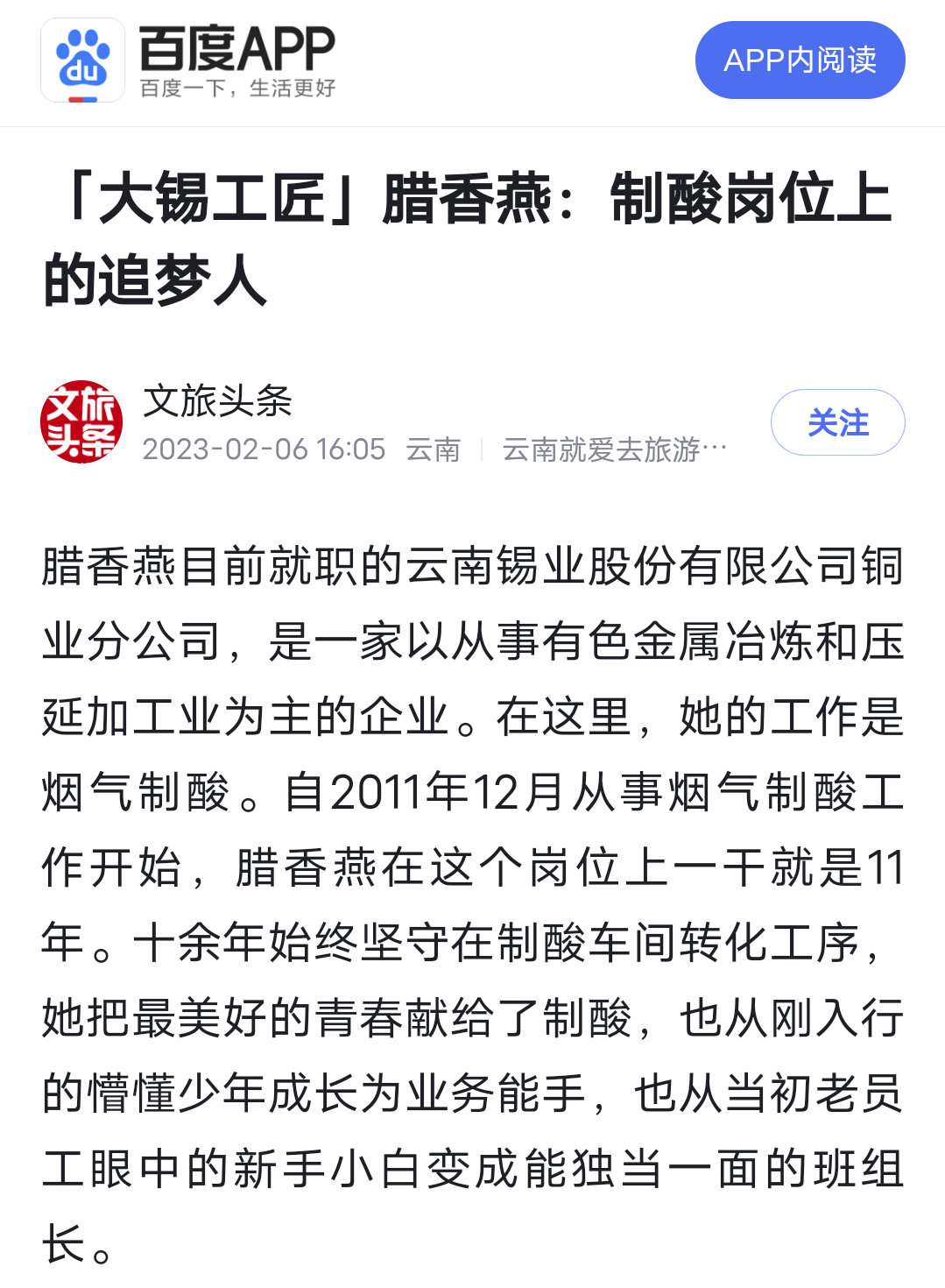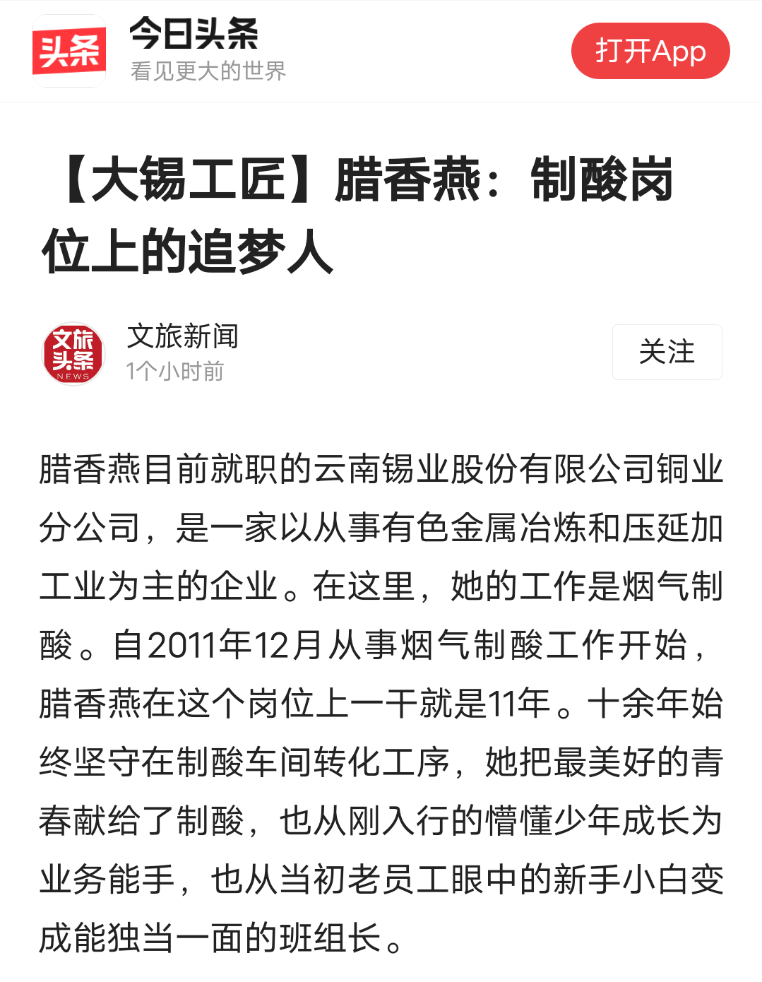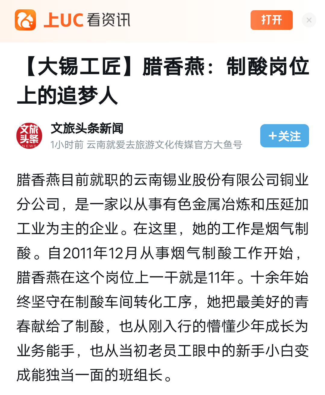 今日头条、百度、网易、搜狐、一点资讯、阿里文娱、文旅头条:【大锡工匠】腊香燕:制酸岗位上的追梦人