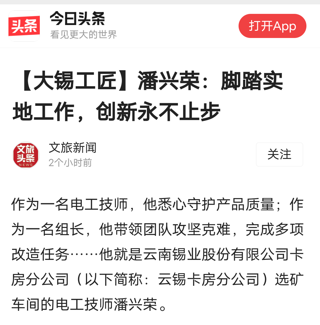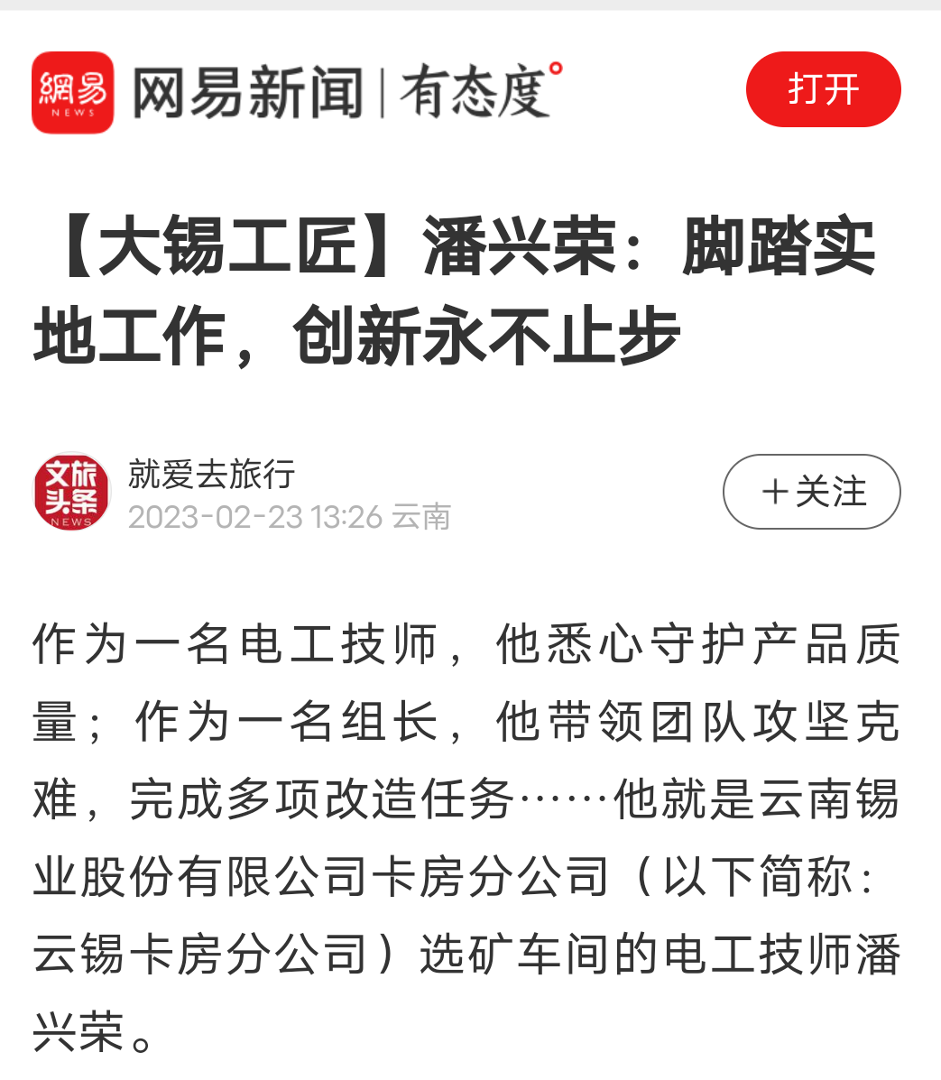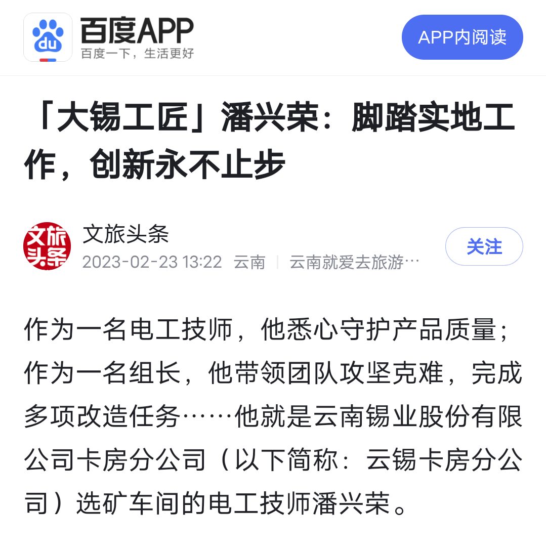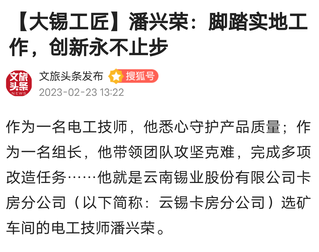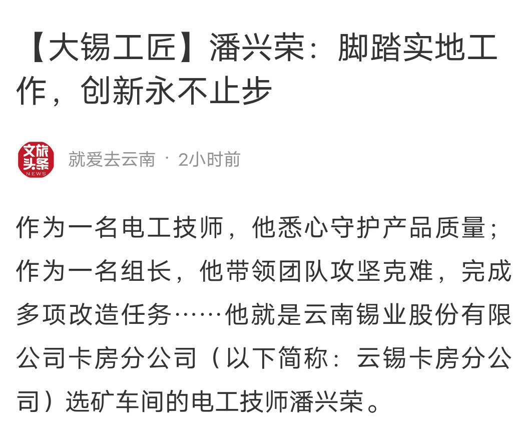 今日头条、百度、网易、搜狐、一点资讯、文旅头条:【大锡工匠】潘兴荣:脚踏实地工作,创新永不止步