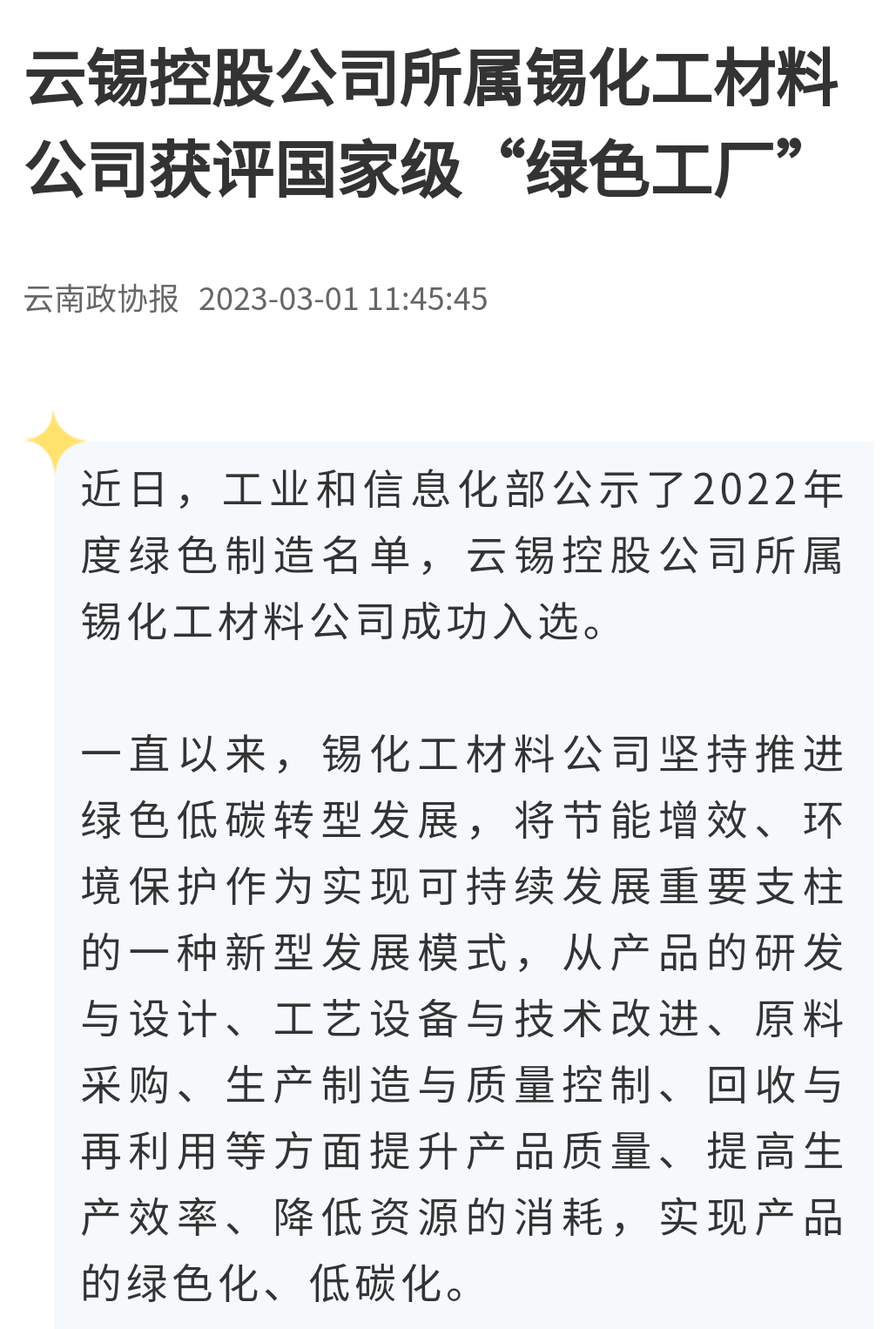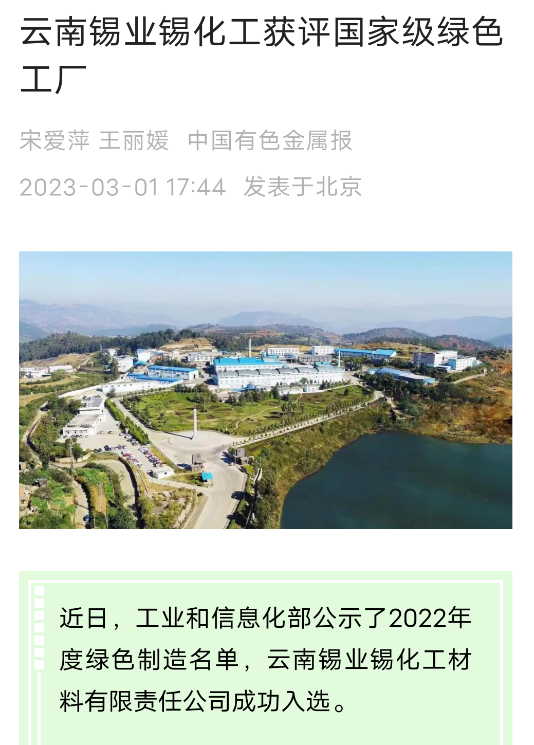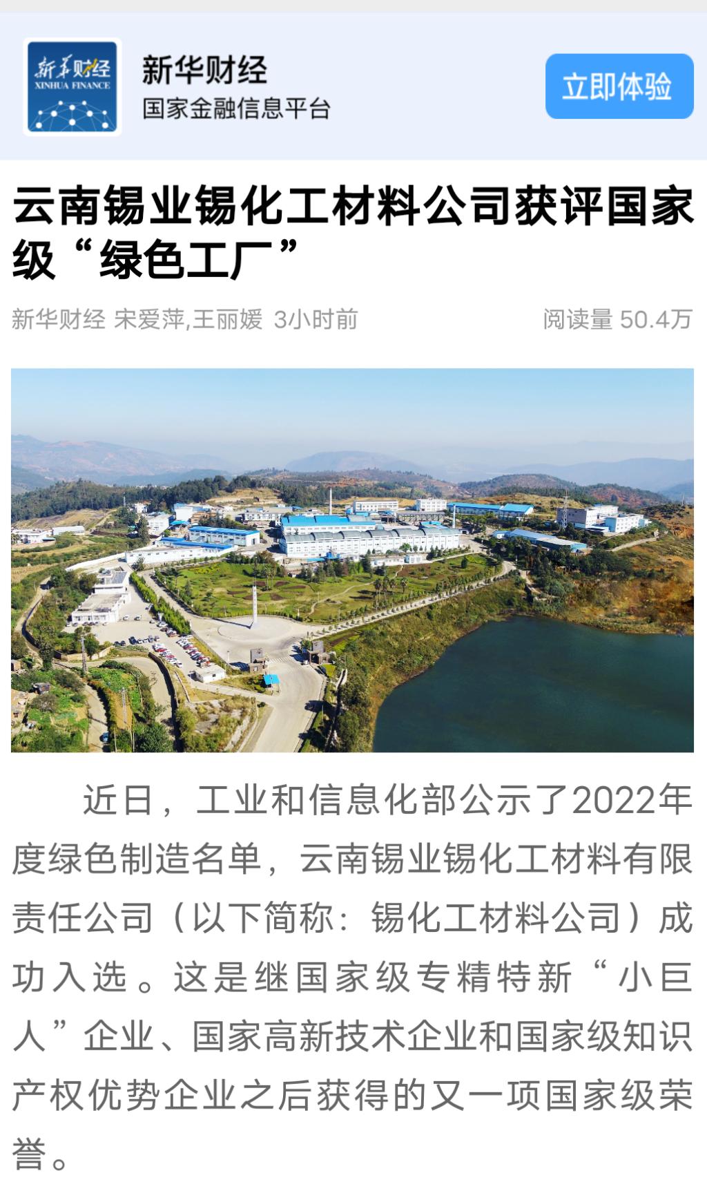 新华财经、云南国资、云南政协报、中国有色金属报、文旅头条:J9国际站登录锡化工材料公司获评国家级“绿色工厂”