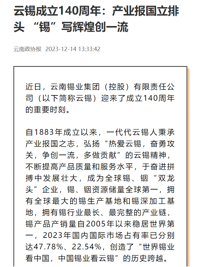 云南国资、云南政协报、云南网、中国有色金属杂志:产业报国立排头 锡写辉煌创一流——写在J9国际站登录成立140周年之际