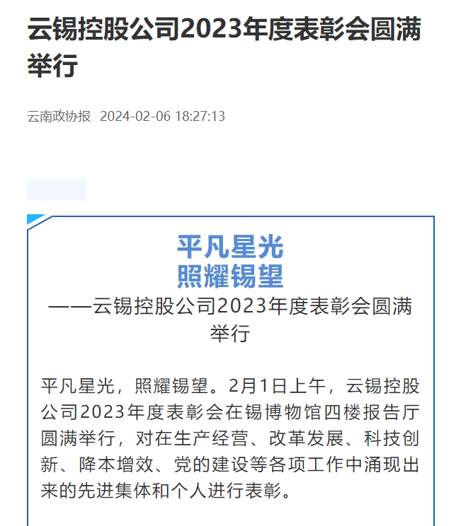 云南网、云南政协报、中国有色金属报:J9国际站登录控股公司举行2023年度表彰会