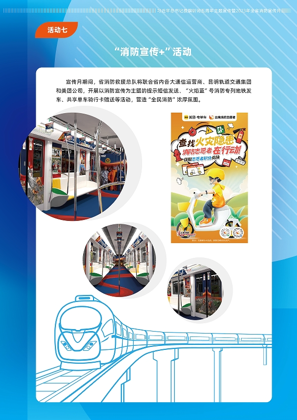 宣传月期间,省消防救援总队将联合省内各大通信运营商、昆明轨道交通集团和美团公司,开展以消防宣传为主题的提示短信发送、“火焰蓝”号消防专列地铁发车、共享单车骑行卡赠送等活动,营造“全民学消防”的浓厚氛围。