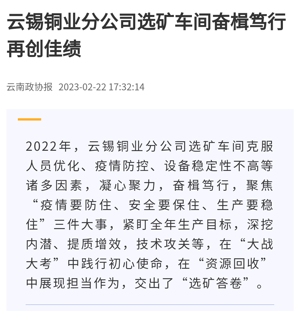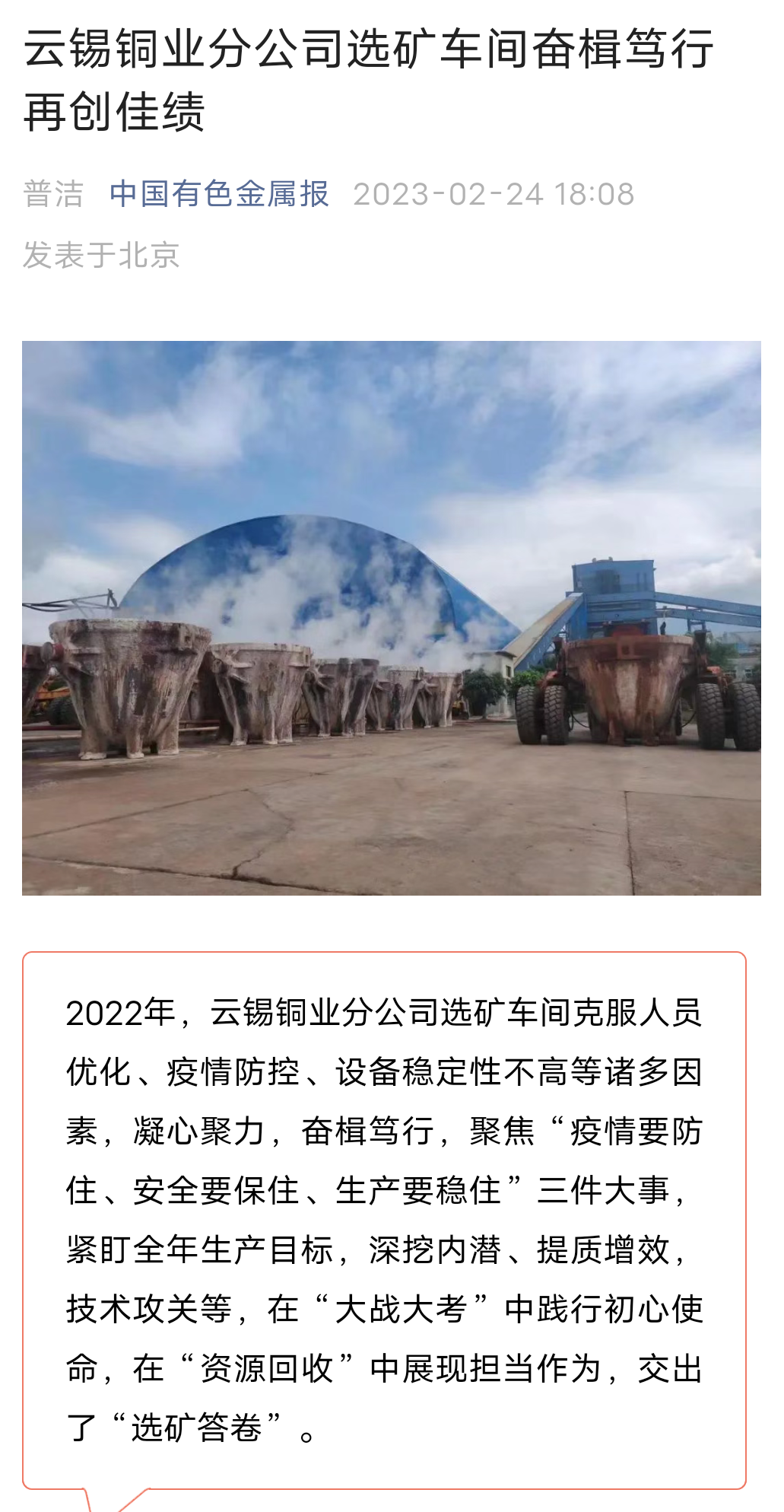 云南政协报、中国有色金属报、文旅头条:J9国际站登录铜业分公司选矿车间奋楫笃行再创佳绩