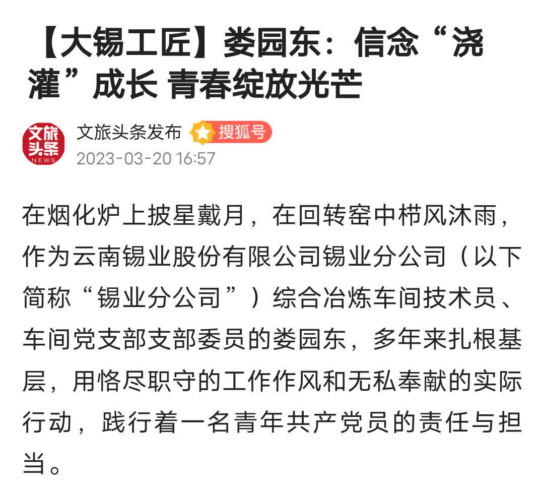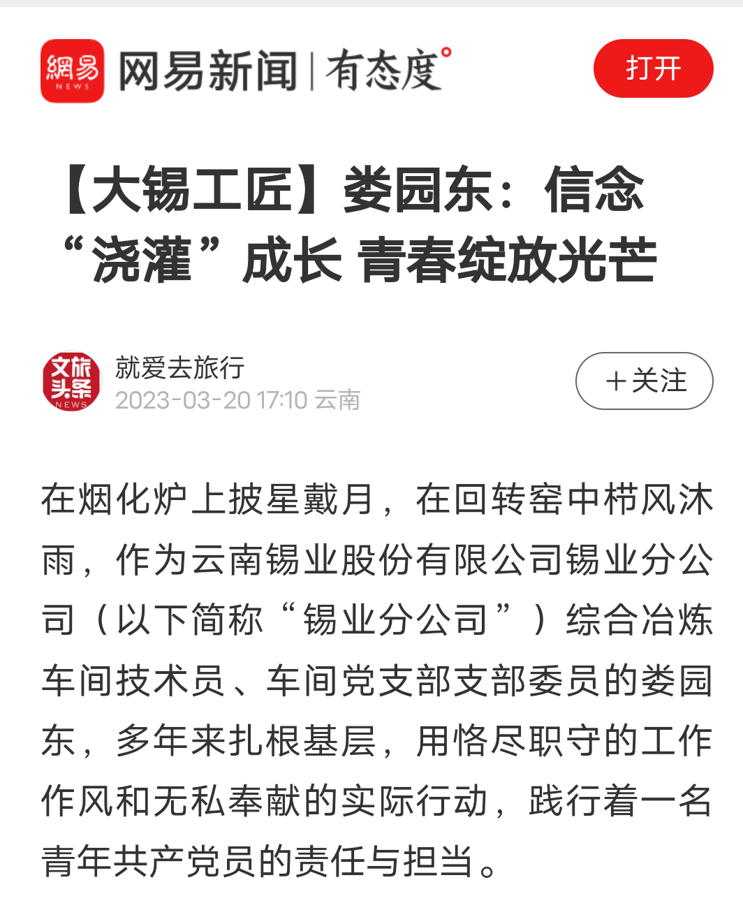 百度、网易、搜狐、文旅头条:【大锡工匠】娄园东:信念“浇灌”成长 青春绽放光芒