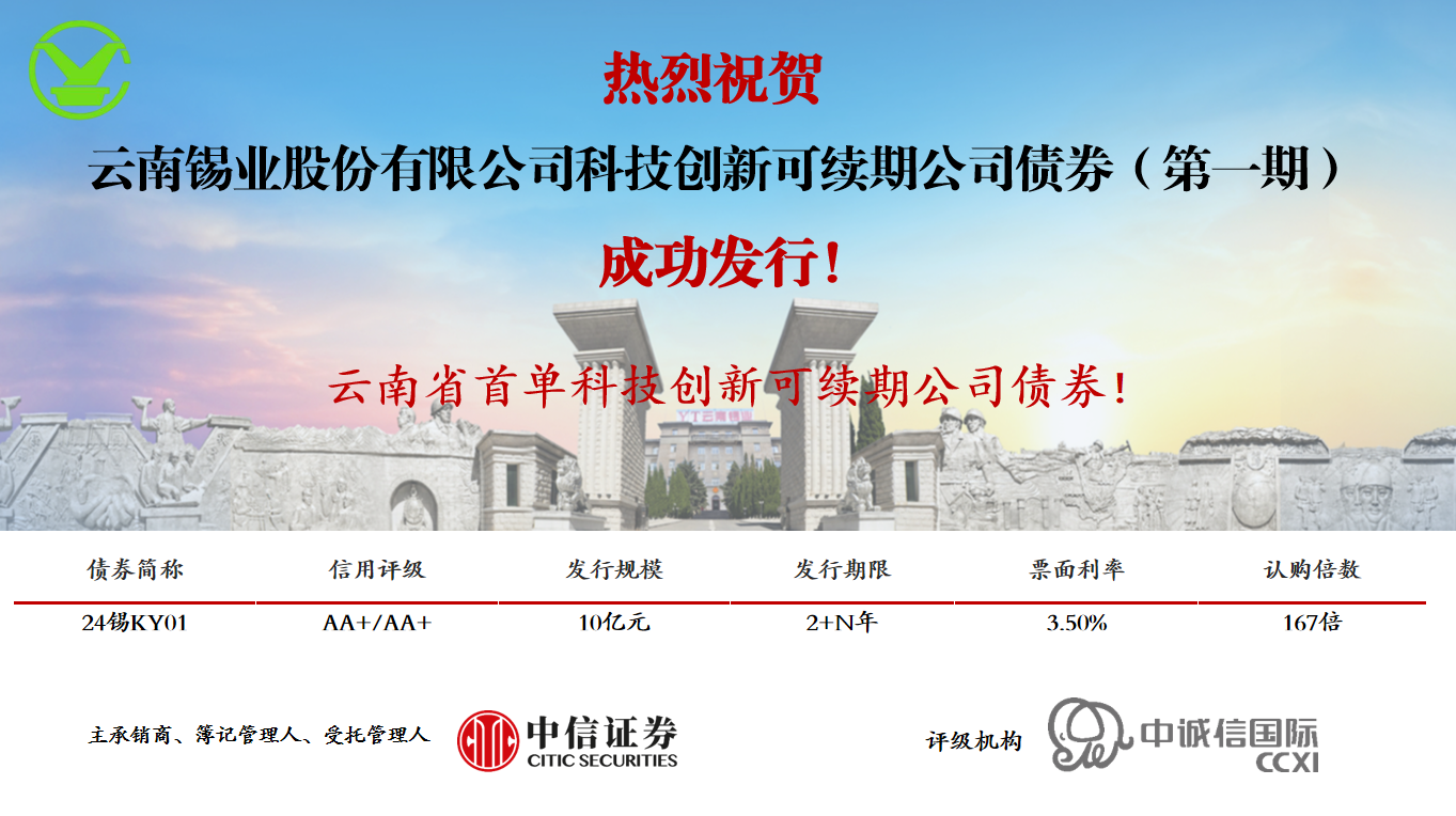 J9国际站登录股份有限公司2024年第一期可续期公司债于今日成功发行,发行规模10亿元,期限2+N年,票面利率3.5%,认购倍数167倍,是云南省首单科技创新可续期公司债券。本期债券的成功发行,是市场对公司经营和资信的高度认可,彰显了全球锡铟行业龙头企业的影响力和实力。